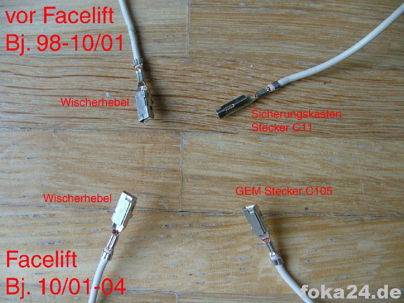 Gebraucht wird dazu ein Intervallwischerhebel und in seltenen Fällen auch noch ein Kabel, sonst nichts weiter. Intervallhebel gibt es zwei verschiedene: mit und ohne Heckwischfunktion, vor-Facelift (bis 10/01) oder Facelift (ab 10/01) ist egal. Das Kabel wiederum unterscheidet sich nach vFl / Fl, da es abhängig davon an verschiedene Stellen gelegt werden muss. Das Fl Kabel ist etwas länger als das für vFl und es hat am zweiten Ende einen anderen Kabelschuh als bei vFl. Außerdem braucht man bei vFl eventuell auch noch einen Stecker.