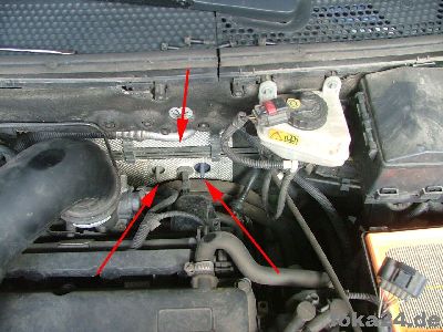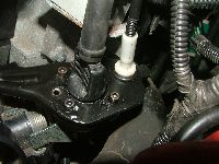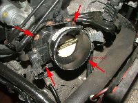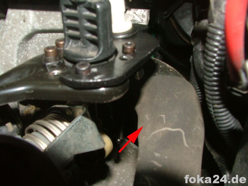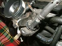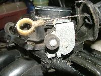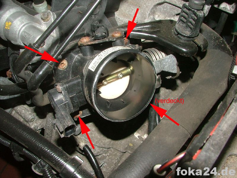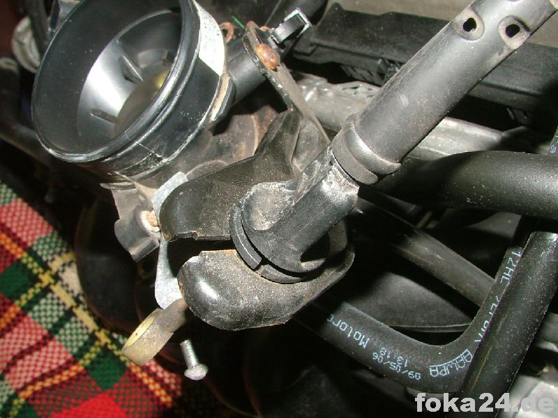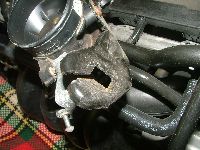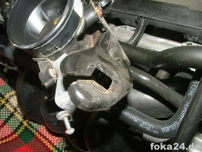 Dies ist die Stelle wo bei 1,4/1,6 die Modifikation vorgenommen werden muss. Am Gaszughalter gibt es kein zweites Loch für den Tempomatbowdenzug, ebenso fehlt am beweglichen Teil der Drosselklappe der Stift zum einhängen des Bowdenzugendes. Beides kann mittels eines speziellen Bauteils nachgerüstet werden. Dafür macht es sich zunächst gut, die Drosselklappe auszubauen. Vorsicht bei den Schrauben - besser vorher mit Entroster o.ä. einsprühen. Es kann sonst evtl. passieren dass Schrauben beim lösen abbrechen.