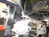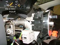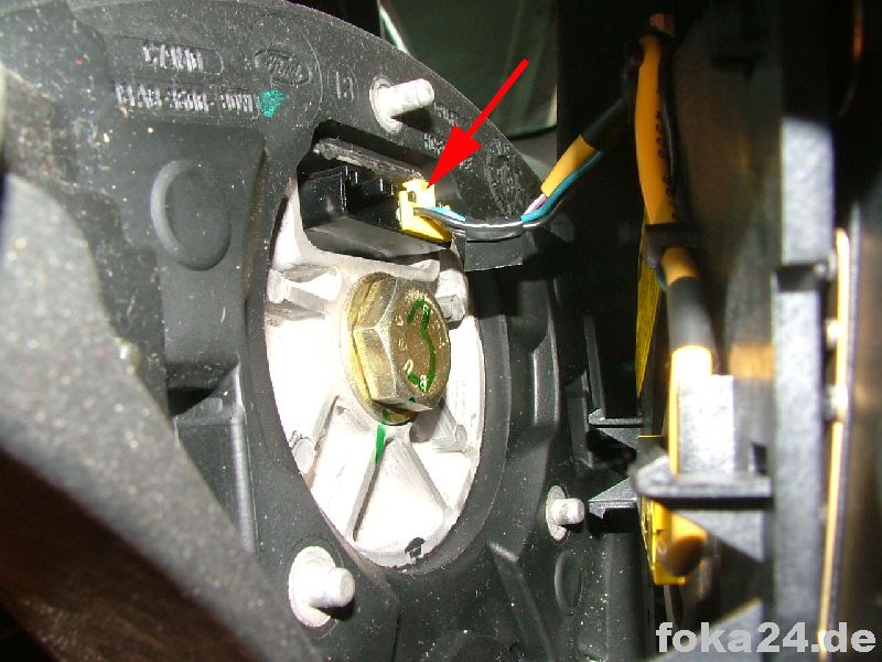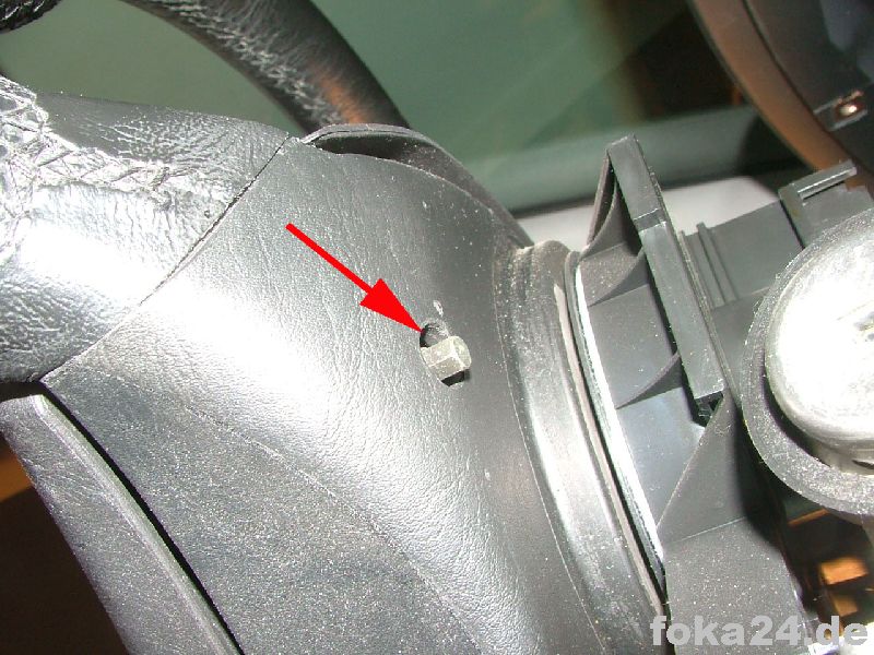 Hinterm Lenkrad wird er 2 kleine Schrauben lösen. Dazu müssen obere und untere Lenksäule demontiert werden (Tip: selber vorher machen, spart Arbeitszeit). Entweder habt ihr davor schon die Kabel zur Wickelfeder gelegt oder ihr wollt es danach direkt machen, dafür muss jedenfalls auch die Verkleidung ab.