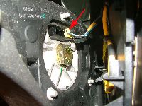 | Tempomattastenstecker auf dem linken Steckplatz. Gut zu sehen die drei Aussparungen für die Airbagclips |