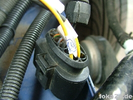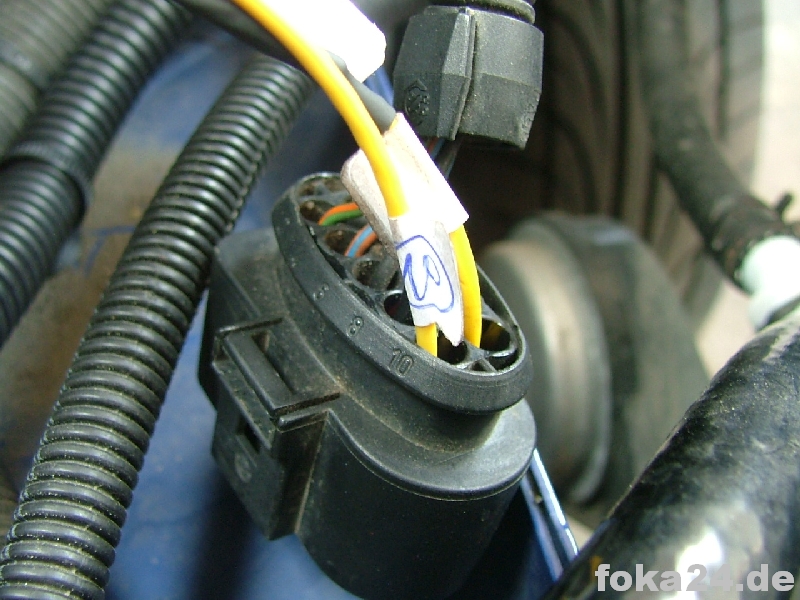 Die Stecker aus dem Hella Kabelsatz, die an den Scheinwerfern ankommen, sind abzuschneiden. Von dem gelben, roten und schwarzen Kabeln sind jeweils nur die gelben zu verwenden und an Pin 9 des Fl Scheinwerfersteckers anzubringen (gegebenenfalls VW Reparaturkabel mit Kabelschuh erforderlich). |