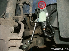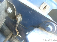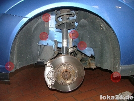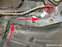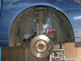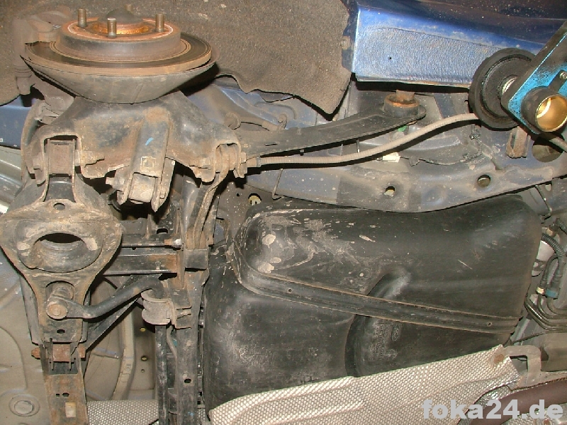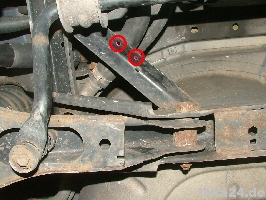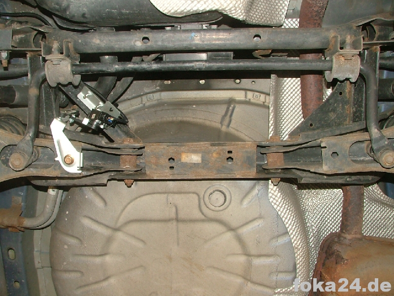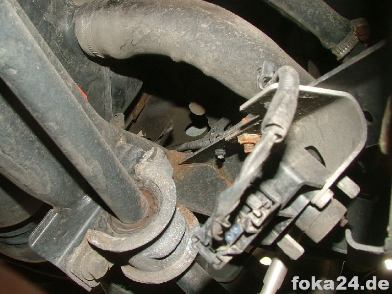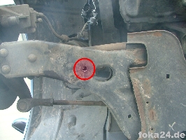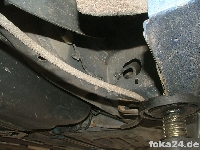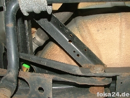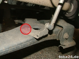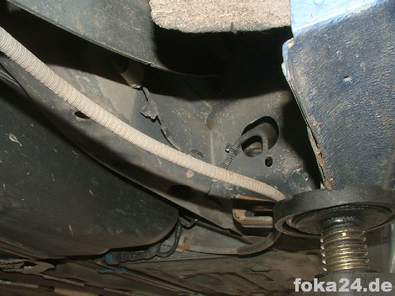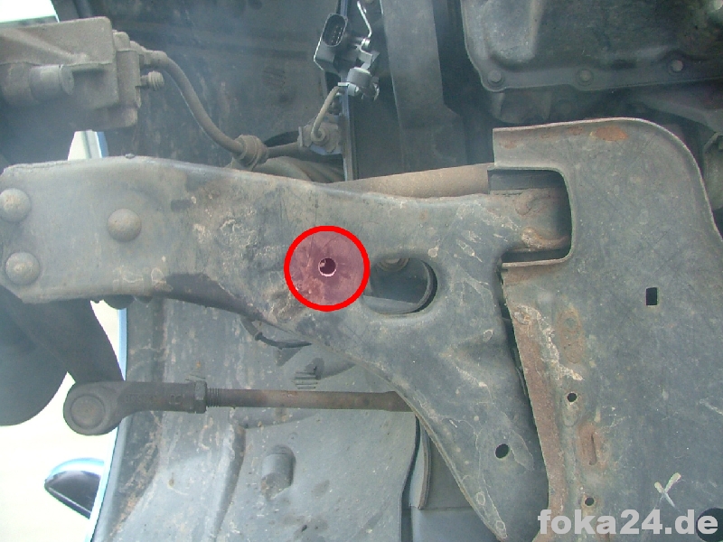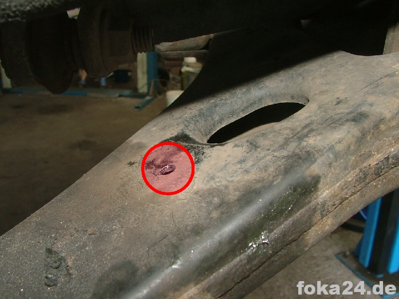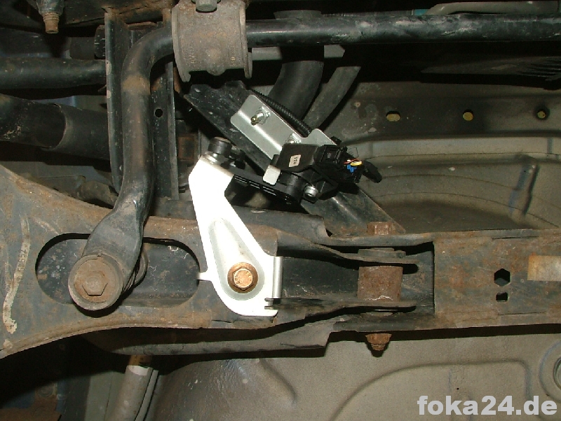 Der Vorderachssensor wird am rechten vorderen Querlenker platziert. Zwei Löcher werden benötigt, eins an der Karosserie im Radhaus und eins am Querlenker. Das an der Karosserie haben alle vFl/Fl, das am Querlenker nur die Fl. Original ist das Loch nur in der oberen Schicht des Querlenkers.
