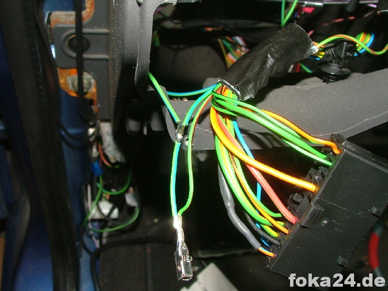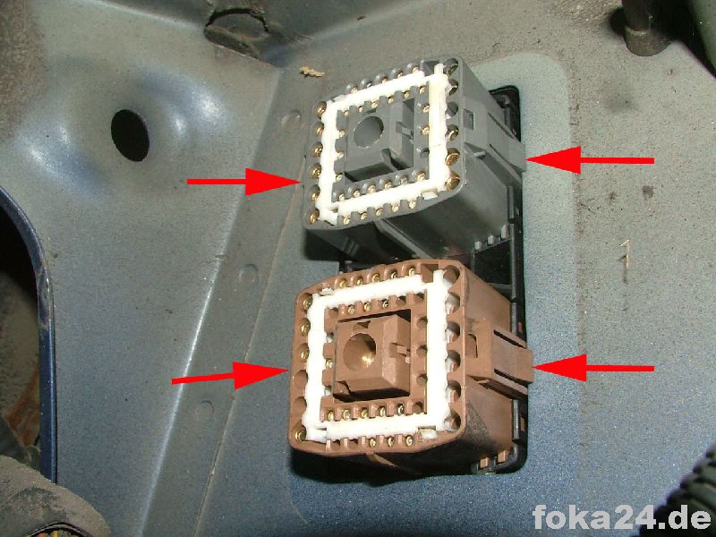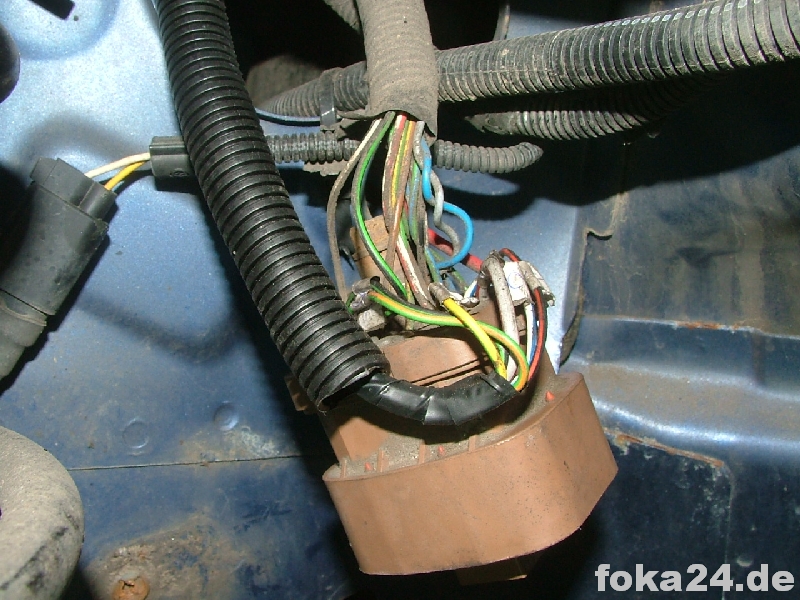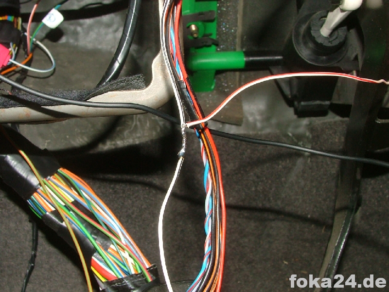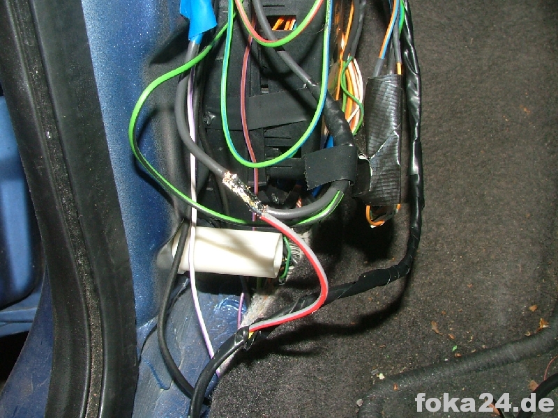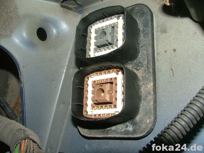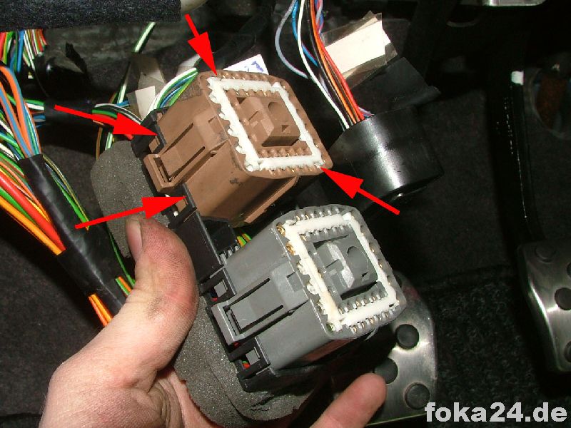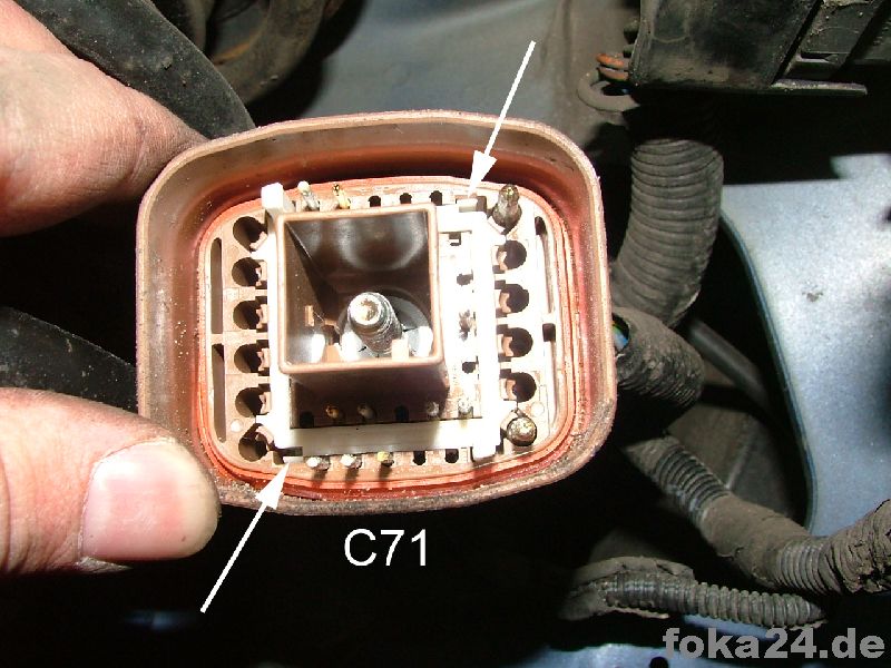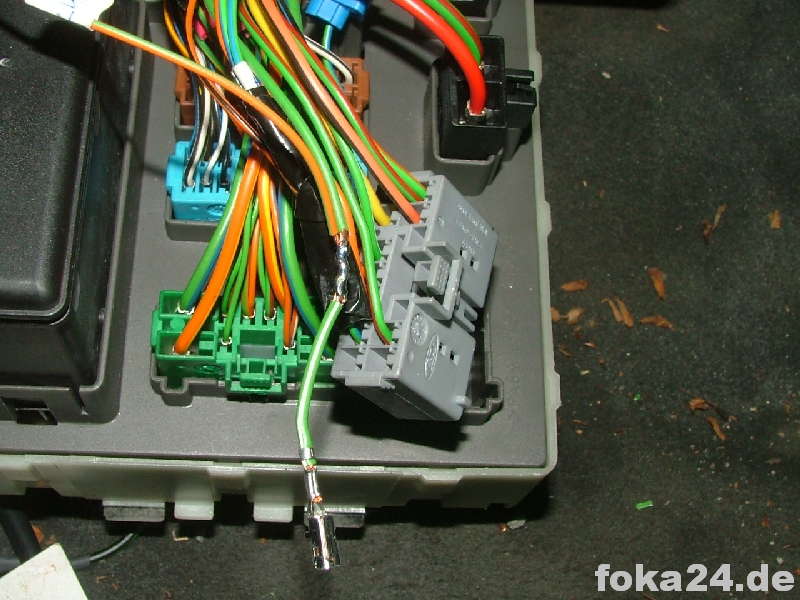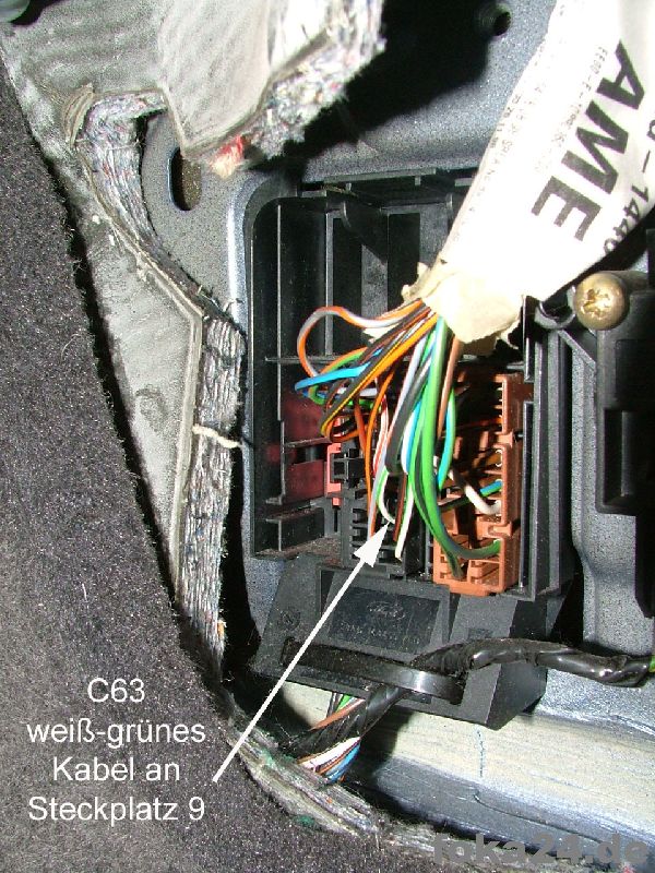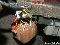 Dann zunächst den unteren braunen Stecker (C71) abschrauben, weißen Sicherungseinsatz entfernen und die Kabel von hinten einführen. Dazu müssen in den meisten Fällen noch die entsprechenden Steckplätze freigebohrt werden. Im besten Fall sitzen aber nur Gummipfropfen drin.