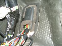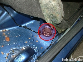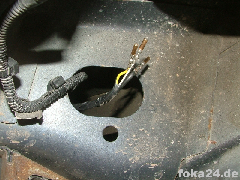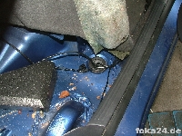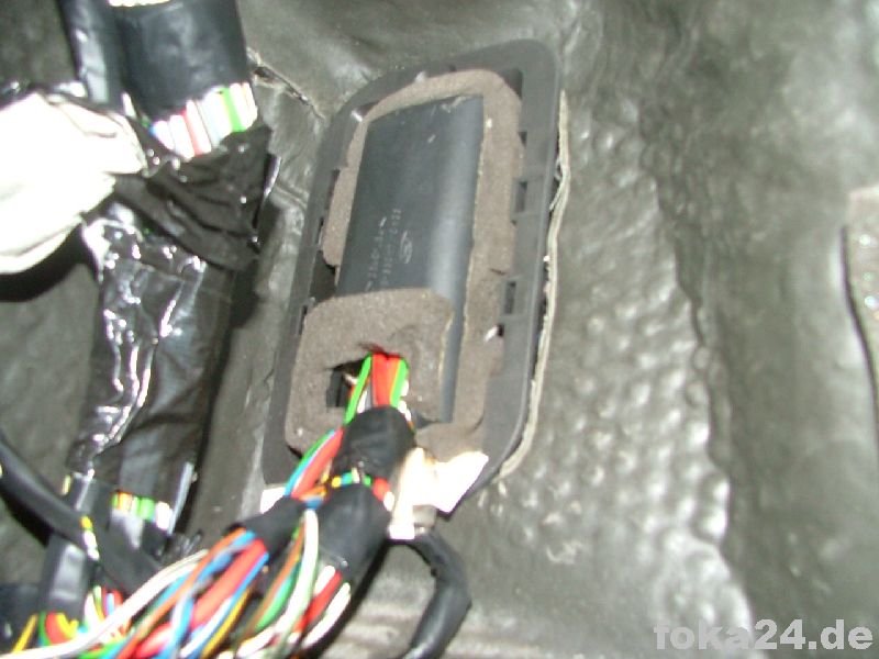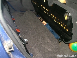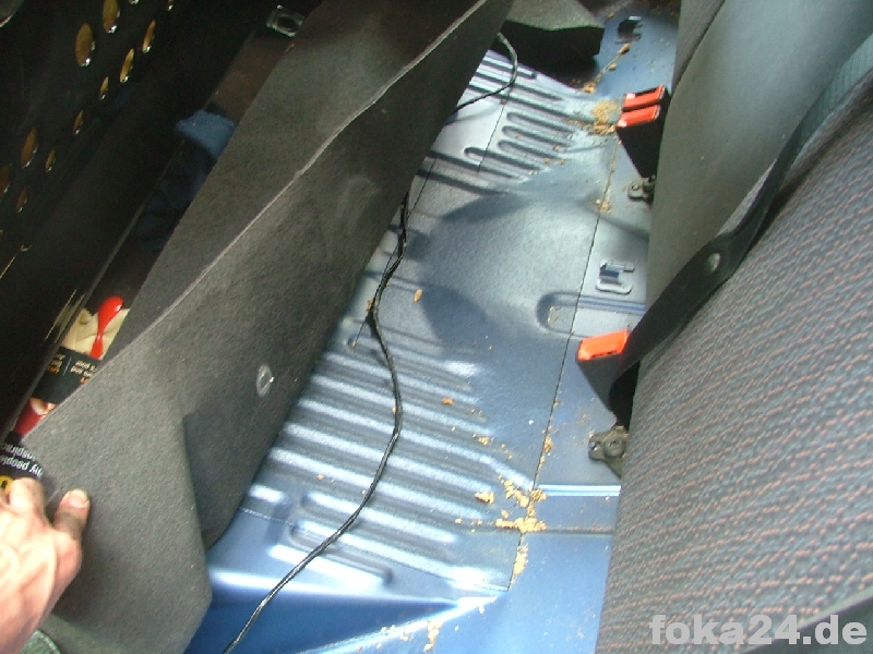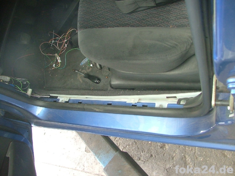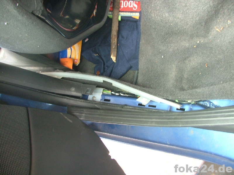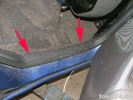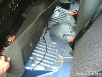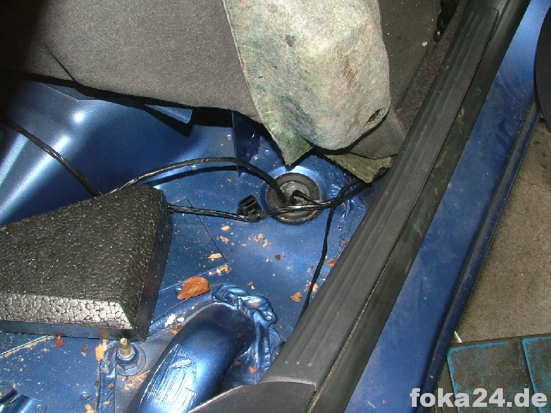 | Rückbank hochklappen | Einstiegsleiste ausclipsen (vorne mit Schraubendreher drunterfahren und aushebeln, hinten hängen lassen) | Teppich hochheben. Durch den Gummistopfen müssen die Kabel. |