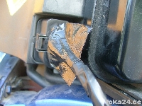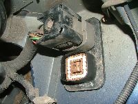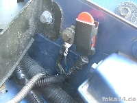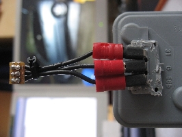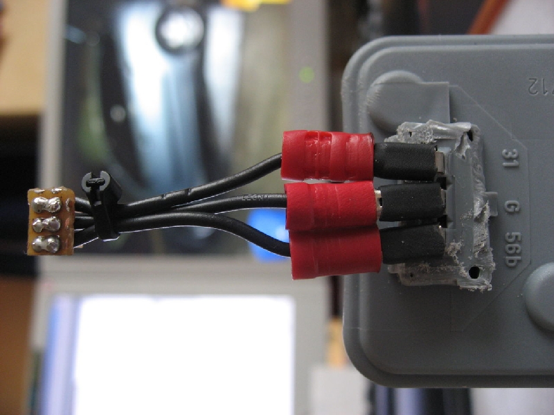 Auf Nummer Sicher geht man wenn man die mitgelieferten Hella Stellmotoren verbaut. Dann ist das ganze System komplett von Hella und nur noch mechanisch mit den Ford Xenon Scheinwerfern verbunden. Die Kugelköpfe der Stellarme passen in die Aufnahmen der Xenonscheinwerfer. Es müssen allerdings entweder die Schweinwerferdeckel oder die Rückseite der Stellmotoren modifiziert werden da sie sonst nicht in das Scheinwerfergehäuse passen. Hier ein Bild von der Variante modifizierter Stellmotor: Foto: Fofo 1.8/Manuel Bei der Verwendung der Hella Stellmotoren werden alle drei Kabel aus dem Hella Kabelsatz benötigt. Je nach Modifikationsvariante ist der Stecker abzuschneiden (siehe Bild) oder er kann auch verwendet werden, z.b. wenn die Scheinwerferdeckel so modifiziert werden dass er noch mit ins Gehäuse passt oder von außen aufgesteckt werden kann. |