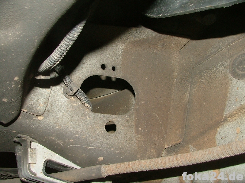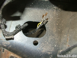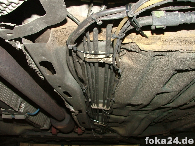 Der Kabelbaum ist an der Achse an nicht beweglichen Teilen zu befestigen und zur rechten Fzg.seite zu führen. Die Demontage des rechten Hinterrades ist hier hilfreich, aber nicht Pflicht. Der Kabelbaum läuft dann an der rechten Fzg.seite entlang der Bremsleitungen ein Stück Richtung Fzg.front bis zu einem ovalen Loch. Bei Fl befinden sich über diesem 2 kleine Löcher - dort wird der dreieckige Verbindungsstecker C54 zum Innenkabelsatz befestigt. Bei vFl sind diese Löcher nicht vorhanden, ich habe auch darauf verzichtet diese extra zu bohren.