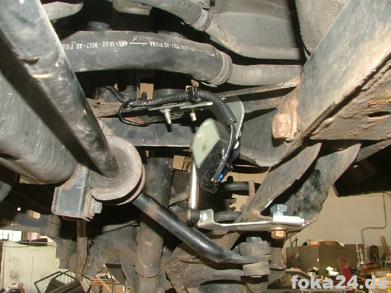 Die Einbauposition bitte den Bildern entnehmen. Die obere Sensorplatte wird mit zwei M6 Schrauben an der Verstrebung befestigt, das Gegengewinde befindet sich in der Sensorplatte. Wegen der Benzinleitung ist in den meisten Fällen ein 10er Maulschlüssel erforderlich da man mit einer Ratsche keinen Platz zum aufsetzen hat. Die untere Sensorplatte wird mit einer M10 Schraube am Querlenker befestigt. Als Gegenstück wird eine M10 Mutter benötigt (keine offizielle Ford Teilenummer verfügbar).