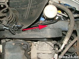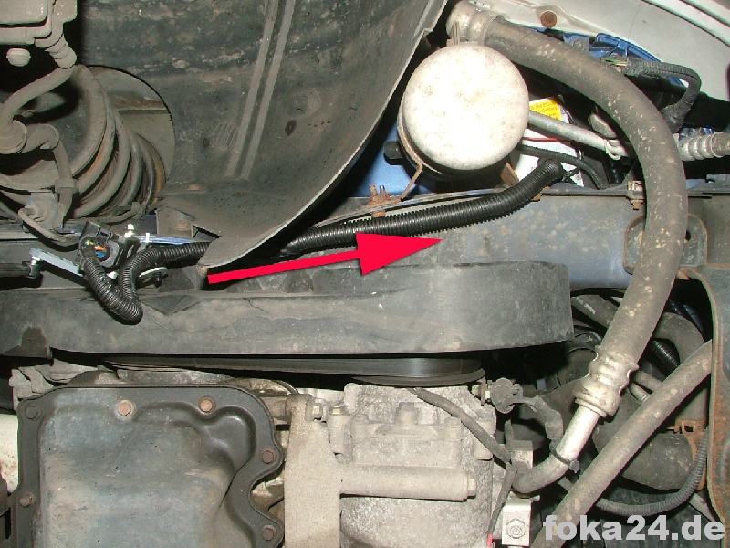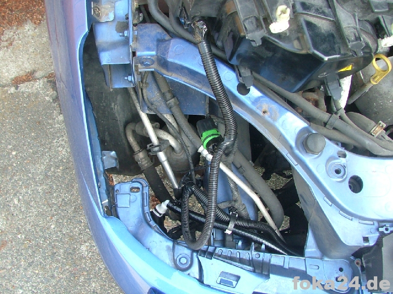 Den Kabelsatz vom Vorderachssensor Richtung Scheinwerfer führen. Dafür die Kabel zunächst an der Unterseite des Längsträgers führen und dann noch oben zum Scheinwerfer Beifahrerseite abbiegen (siehe Bild). Bei der Querung vom Scheinwerfer Beifahrerseite zum Scheinwerfer Fahrerseite den Kühler in Höhe des Stoßstangenträgers queren. Den Kabelsatz so ausrichten dass die Abzweige zu den Scheinwerfern richtig liegen (bei Fl je drei Kabel mit Kabelschuhen, bei vFl die Adapter). Hinter der Fahrerseite geht der Strang weiter zu C71.