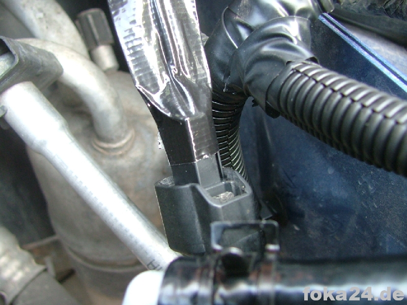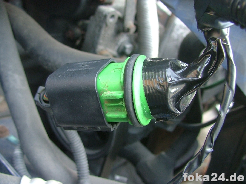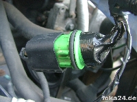 Das Kabel vom Sensor an der Feuerwand nach oben führen und im Steuergerät in den linken Steckplatz stecken (linkes Bild).