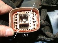 Der Kabelsatz den ich mir gebaut habe führt nicht nur wie original vorgesehen die 3 Kabel zum Hinterachssensor und zum Geschwindigkeitssignal über C71 nach innen, sondern auch die für Diagnose, Abblendlichtsignal und 12V Zündungsplus. Das hatte den Grund dass ich diese Kabel nicht im Motorraum verlöten wollte (umständlich wegen Feuchte-, Hitze- und Marderschutz). In C71 sind noch genügend Plätze frei um diese Kabel nach innen zu führen und dort zu verlöten.