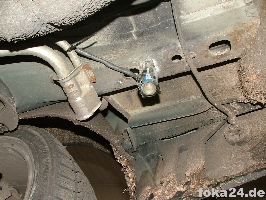 Zunächst ist der Ultraschallsensor an geeigneter Stelle im hinteren Teil des Wagens anzubringen, so dass er senkrecht nach unten zeigt. Dafür empfiehlt sich der Längsträger hinter der Kraftstoffleitung (linkes Bild). Nach dem Bohren und vor dem Anschrauben des Sensors das Verzinken nicht vergessen. Das Anschlusskabel kann am Unterboden nach vorne zur Feuerwand geführt werden (rechts Bild)
